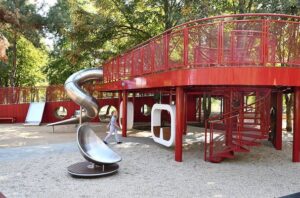 Здесь также оборудована двухуровневая площадка с большим пандусом. На верхнем уровне сконструированы подвесные сетка и пешеходный мостик, а на нижнем — специальные туннели, где могут отдохнуть дети.