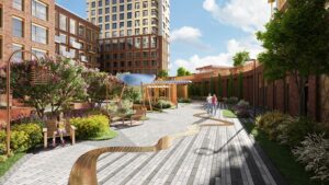 Благоустройство внутреннего двора и эксплуатируемой кровли стилобата, объединяющего восемь жилых секций, будет выполнено в районе Нагатино до конца года. Девелопером выступает компания «Страна Девелопмент».