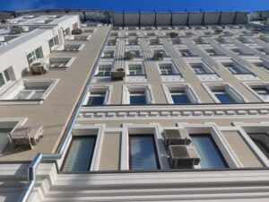 Чтобы вернуть зданию исторический облик, специалисты расчистили фасады, восстановили элементы и лепной декор. Кроме того, они заменили цоколь, отремонтировали крышу и отреставрировали ее кованые ограждения. В интерьерах работы коснулись исторических столярных заполнений. В подъездах восстановили перила и поручни, заменили входные двери, а также отремонтировали стены, потолки и восстановили отделку.
