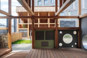 Уникальный объект – экологический плэйхаб площадью почти 330 кв. м в скандинавском стиле расположится на крыше детского сада. Площадка спроектирована по принципам нейродинамики с разнообразием игровых сценариев и оборудованием из натуральных материалов: деревянной кухней и каруселями-гнездами, башней с системой подъема песка, холмом с тоннелем и горкой, а также верандой с панелями-бизибордами. Помимо этого, в детском саду будут актовый зал и кинотеатр. Авторами проекта выступили международное ландшафтное бюро Gillespies и российское бюро «Дружба».