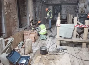 На первом этапе металлическими рамами усилили простенки и перемычки стен, установили опорные столбы в подвале, выполнили противоаварийное усиление кирпичной кладки подвала.